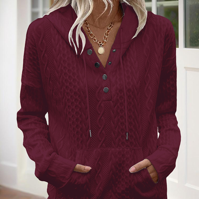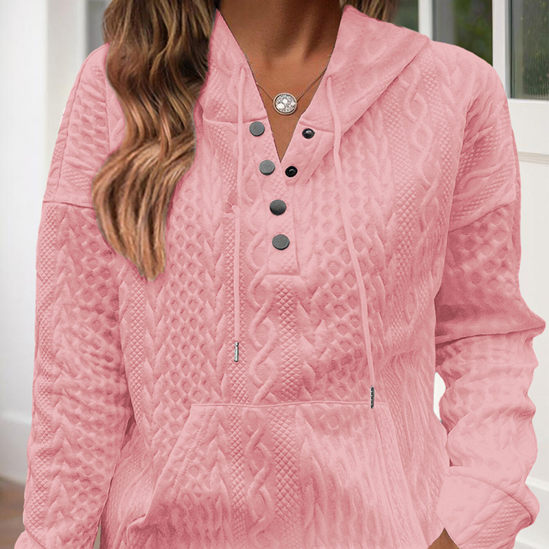 Women’s V-Neck Textured Hoodie – Stylish & Functional Pullover with Button Front & Kangaroo Pockets